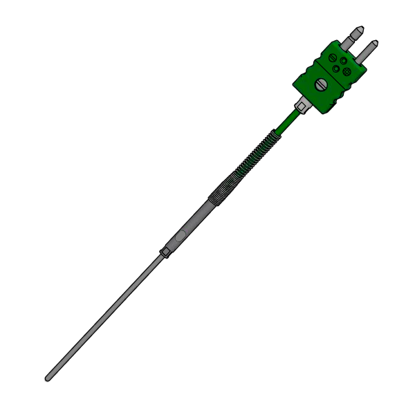Ohebný, minerálně izolovaný termočlánek s kabelem a standardním konektorem/spojkou.
